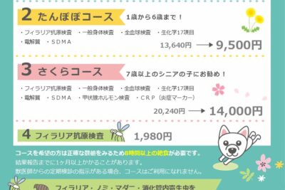 3月1日5月31日までワンちゃんのフィラリア予防を兼ねた健康診断キャンペーンを実施します。 フィラリア予防は4月中に開始していただければ安全ですが、 4月、5月は混雑しますので、なるべくお早目にお越しください。 また、せっかくの採血の機会(みんなフィラリア検査が必須)ですので...
